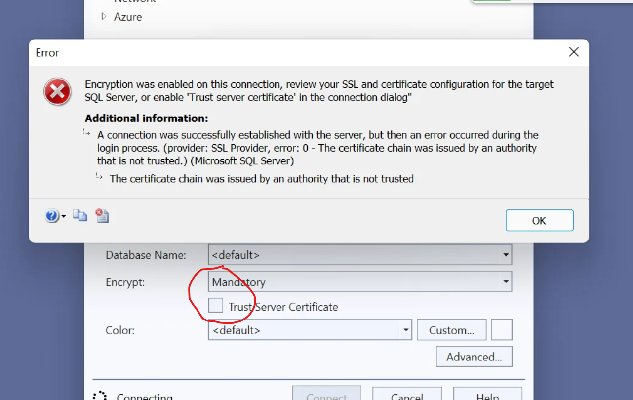 A connection was successfully established with the server, but then an error occurred during the login process. (provider: SSL Provider, error: 0 – The certificate chain was issued by an authority that is not trusted.) (Microsoft SQL Server, Error: -2146893019)